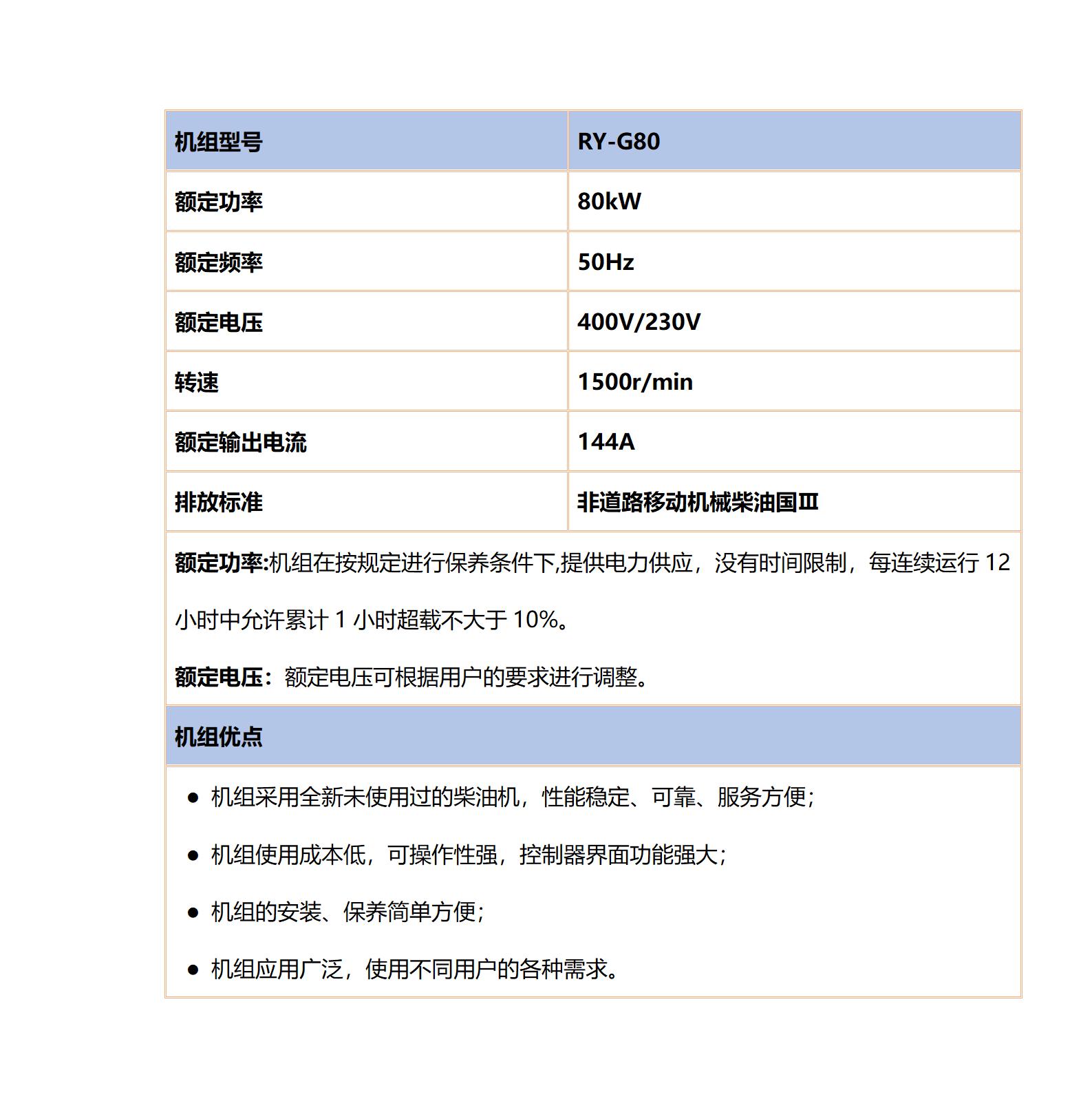 发电功能:额定功率:80kW,额定电压400V/230V,额定输出电流:144A,频率50Hz,能够满足海拔4000米以上的高原地区以及零下30℃至40℃环境下正常运行。