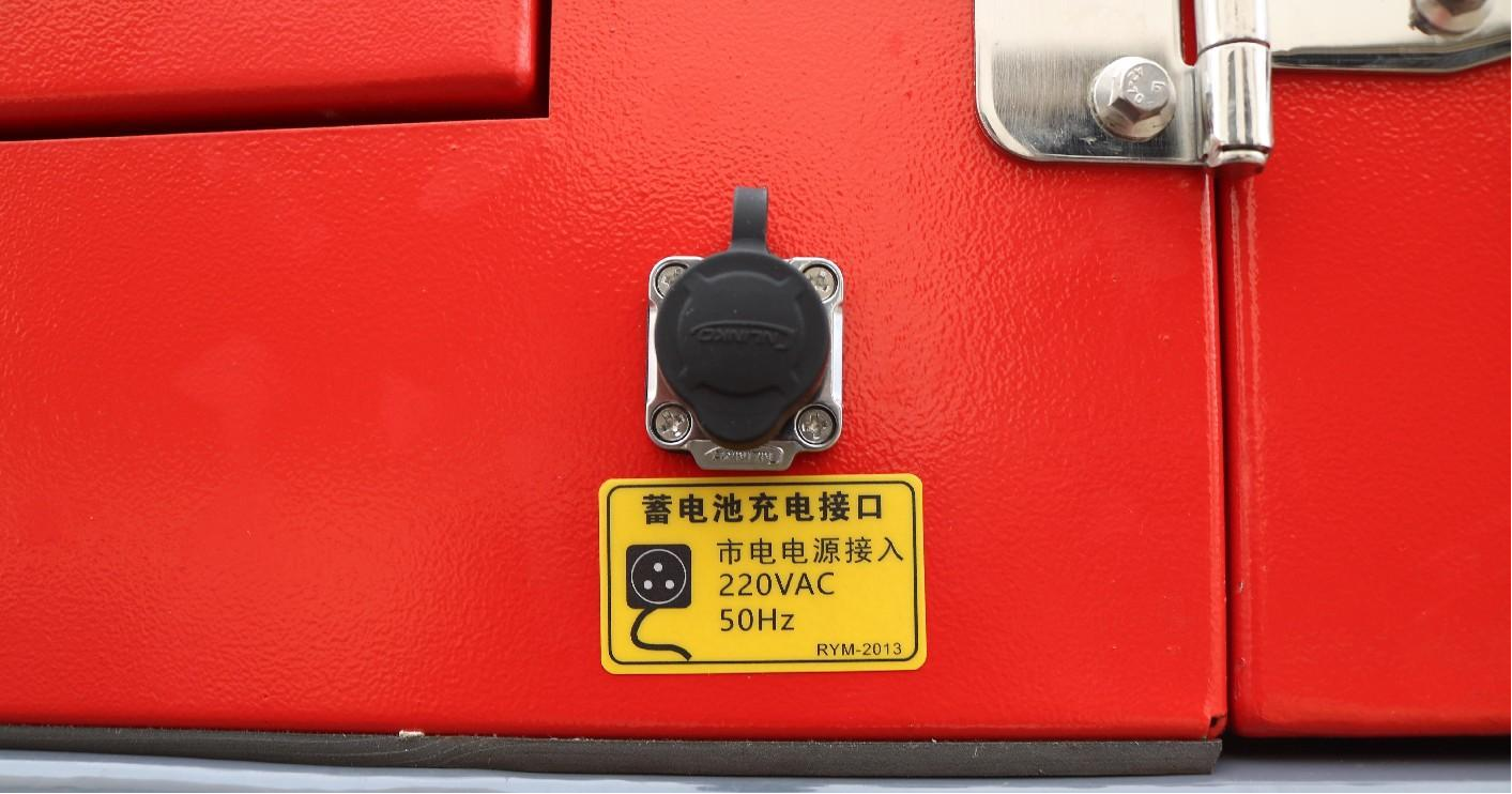 厢体上配有启动电瓶快充接口,长期存放在仓库时,可随时用220V市电给电瓶充电,应及时随拉随用
